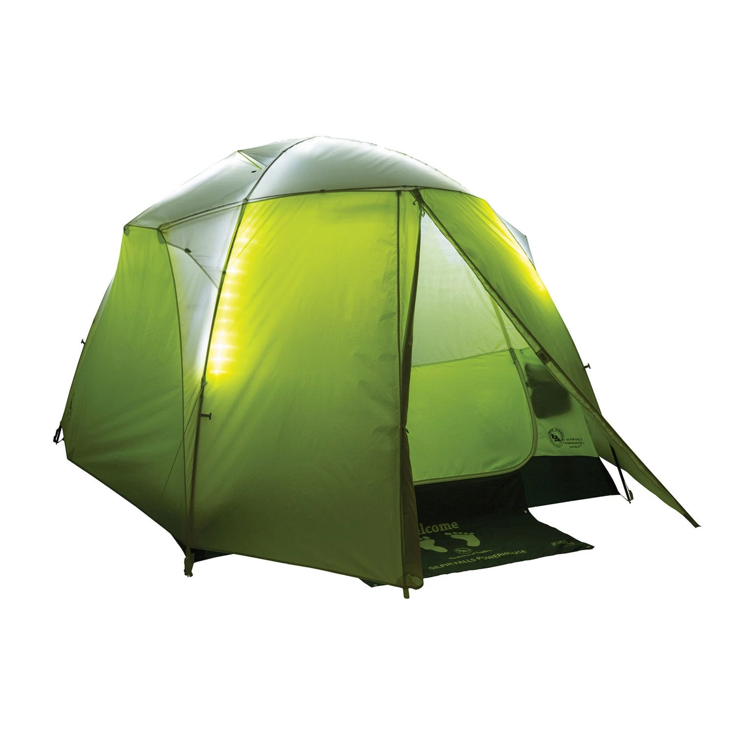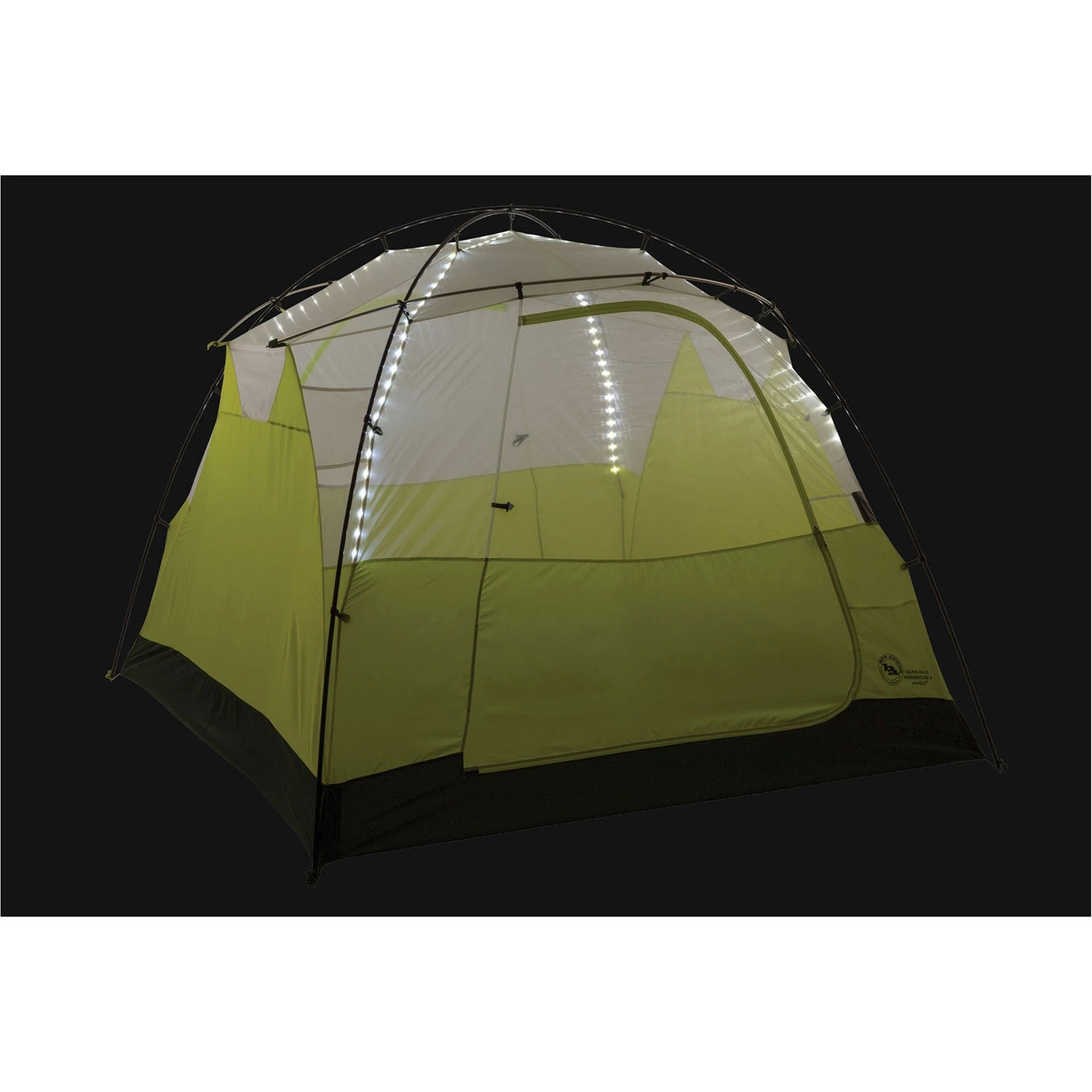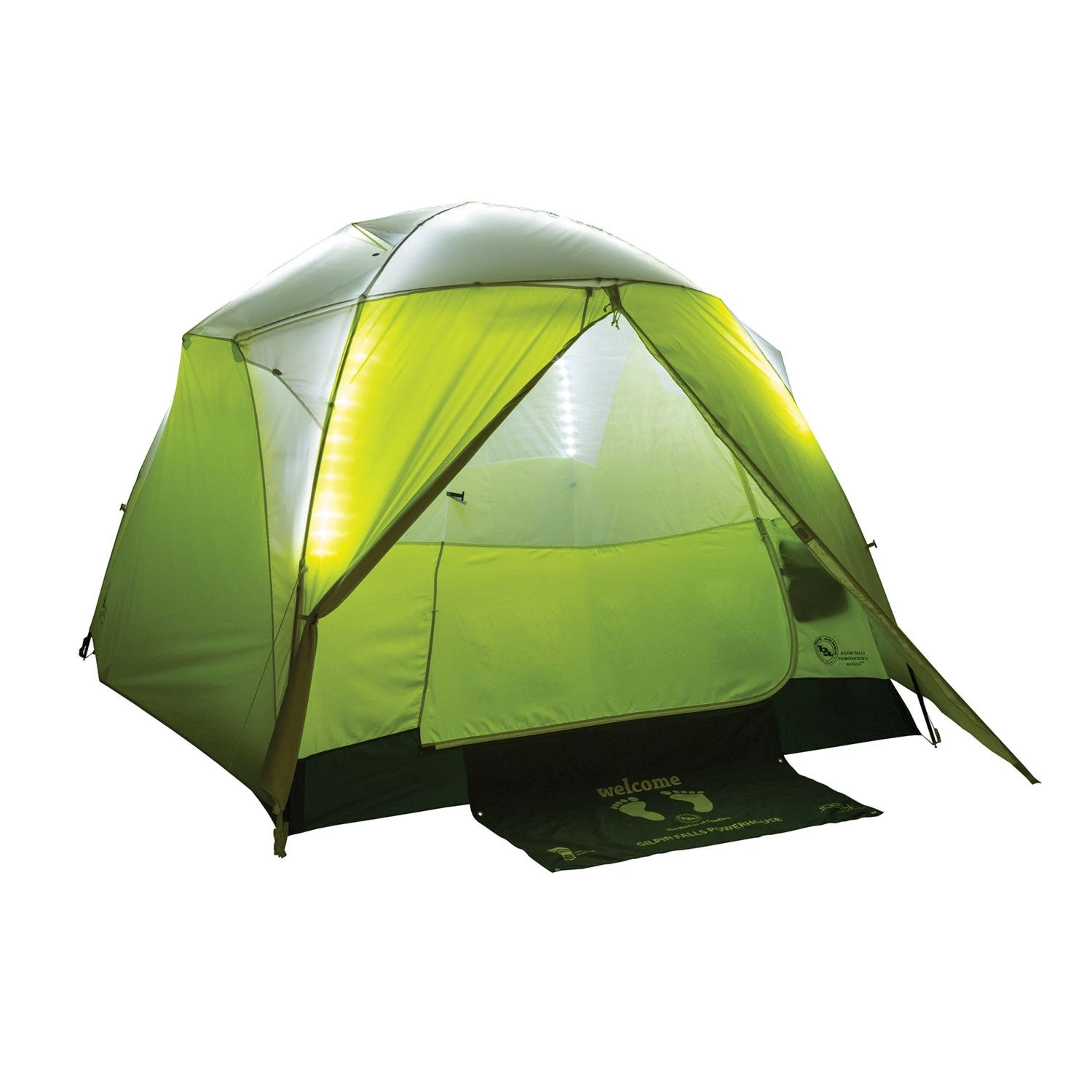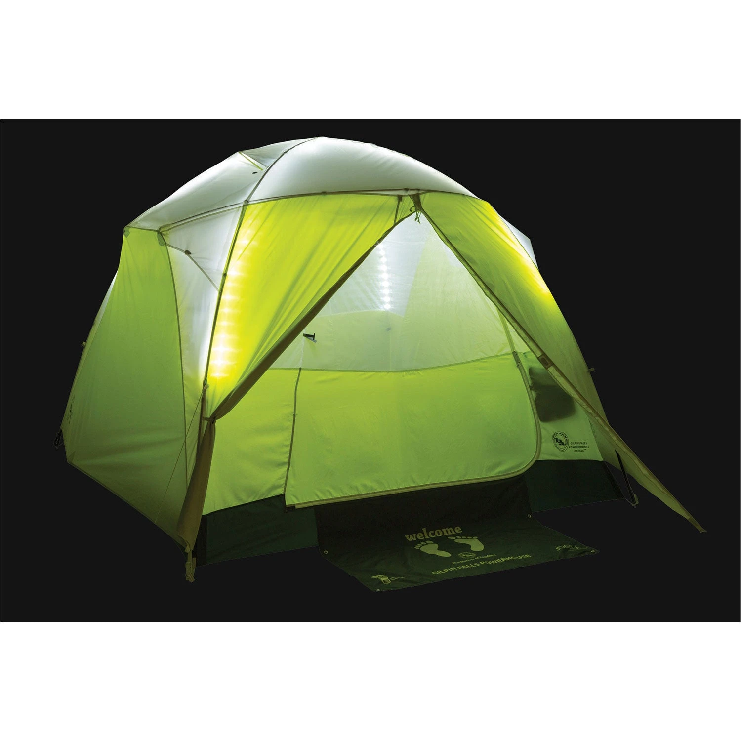 Part of the Big Agnes mtnGLO™ collection, light up your camp with the Gilpin Falls Powerhouse 4 mtnGLO™ camping tent. Illuminated with patent-pending mtnGLO™ Tent Light Technology featuring LED lights integrated into the tent body; experience ambient light in your shelter with the click of a button. Includes a Joey® T55 computerized power supply for lightweight, compact, and convenient charging.